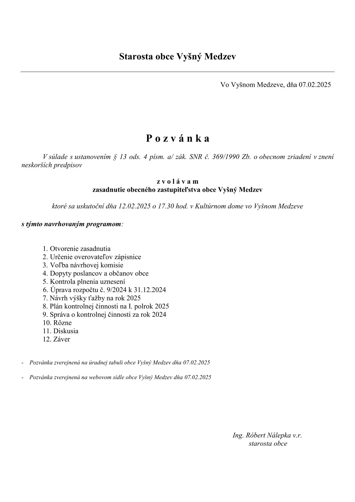 Pozvánka na zasadnutie OZ dňa 12.02.2025