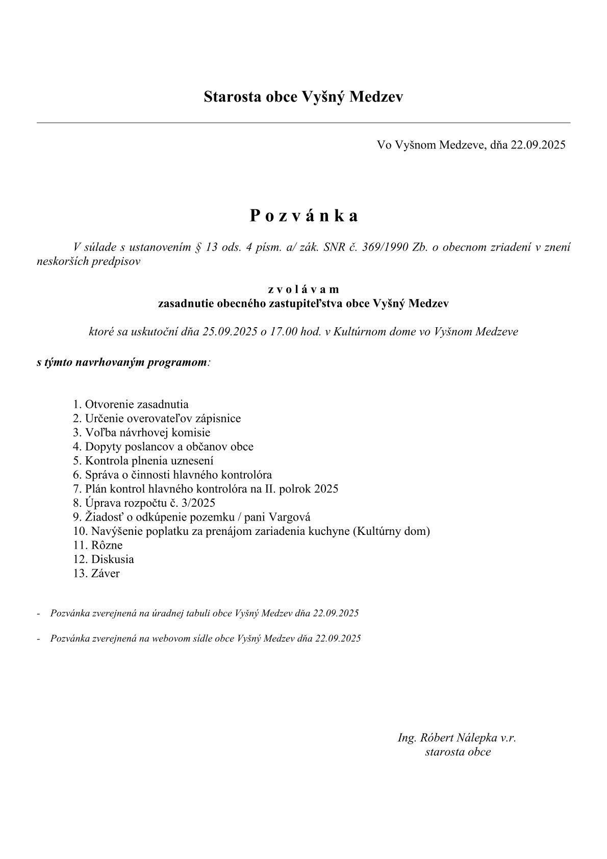 Pozvánka na zasadnutie OZ dňa 25.09.2025