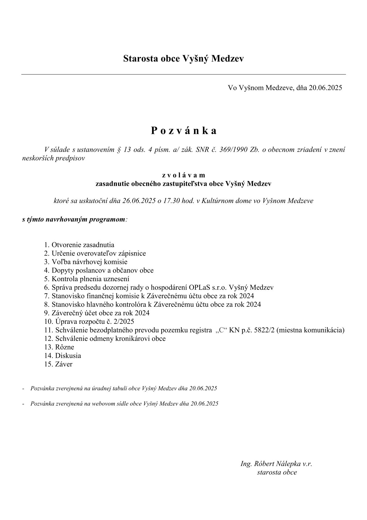 Pozvánka na zasadnutie OZ dňa 26.06.2025