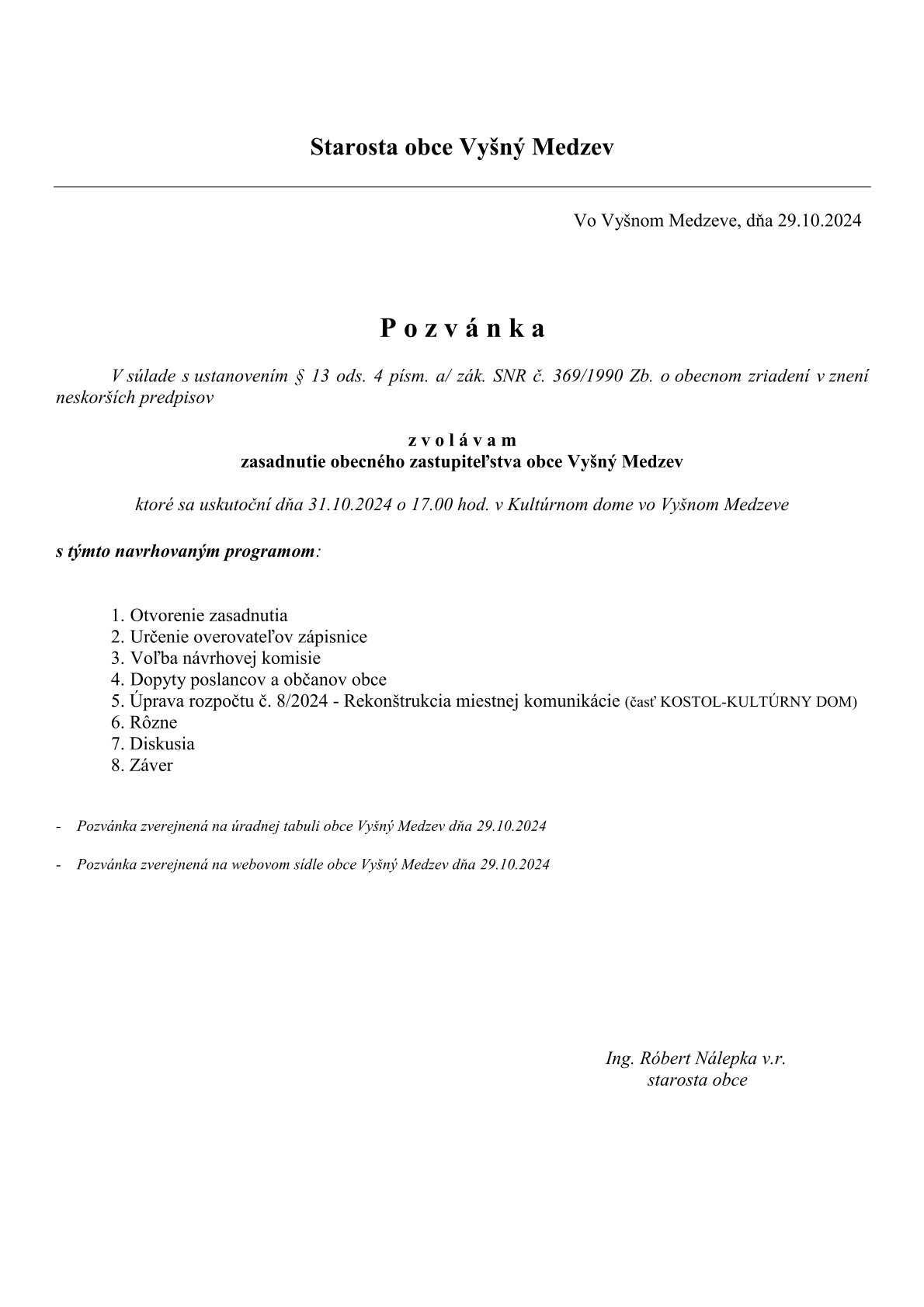 Pozvánka na zasadnutie OZ dňa 31.10.2024
